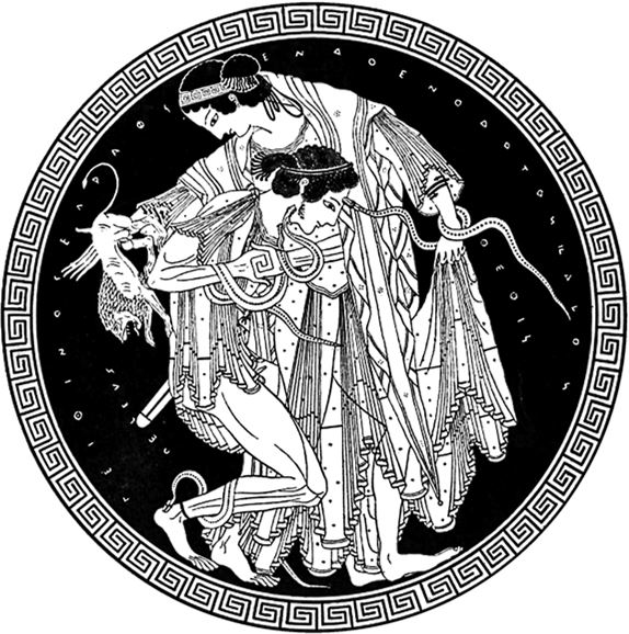 Рис. 1. Фетида и Пелей (краснофигурный классический килик, [2] Греция, V в. до н. э.)