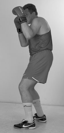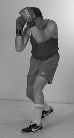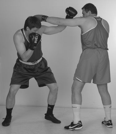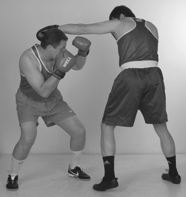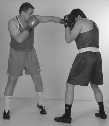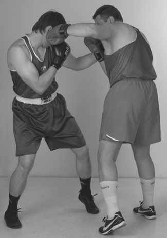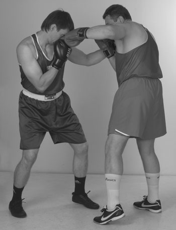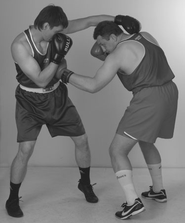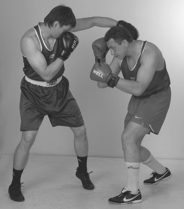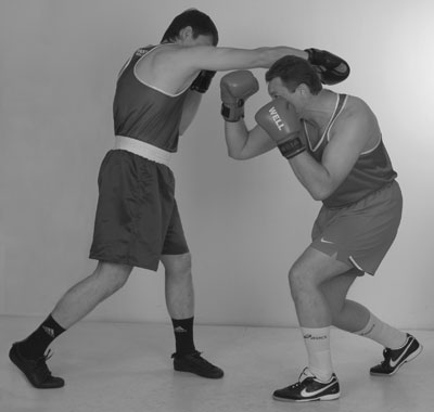 Переднюю руку при этом лучше держать впереди, кулаком к лицу противника. Задняя рука – кулаком у лба. Кулак задней руки совершает небольшие смещения от нашего подбородка ко лбу и назад. Помните: у высоких кулаков самый короткий путь к голове. Более высокое положение заднего кулака определяет цель следующего удара, а это – голова. Поднимаясь из уклона, проталкиваем локтем кулак задней руки в цель, накидывая локоть вверх. Фото 136. Задняя часть тела при ударе развернулась вперед и поднялась немного вверх. Идеальный момент для попадания в голову противника – это момент, когда он после своего удара возвращает руку в стойку, опускает локоть и у него образуется «окно» между кулаком и плечом.