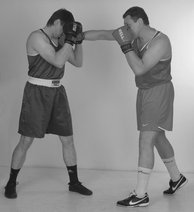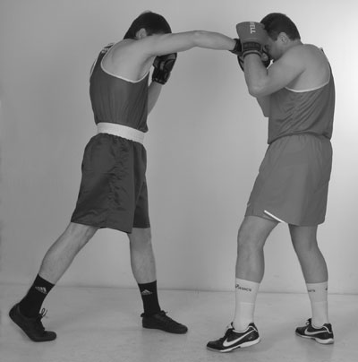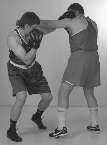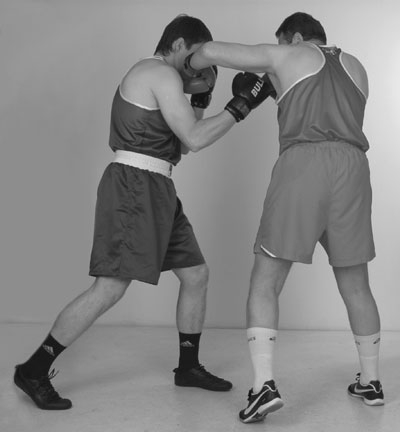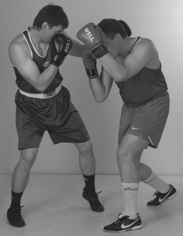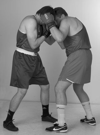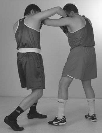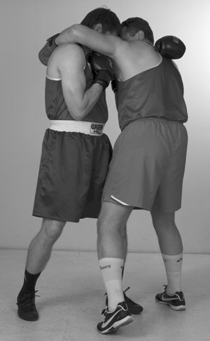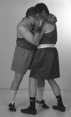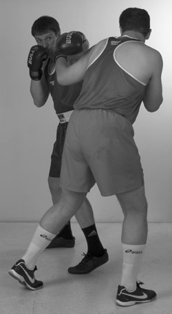 Мы уже знаем комбинацию из двух прямых ударов – передней и задней рукой. С нее и начнем. Пробили ее и остались стоять с разогнутой задней рукой. Теперь, убирая заднюю руку, и немного приседая, делаем шаг в сторону задней ногой, если хотим сместиться. Если же мы хотим остаться под противником, то после удара задней рукой подсаживаемся под его переднюю руку за счет шага вперед передней ногой. В этом близком положении к противнику его легко захватить своими руками за корпус и руки. Клинчевать. Фото 140, 141, 142.