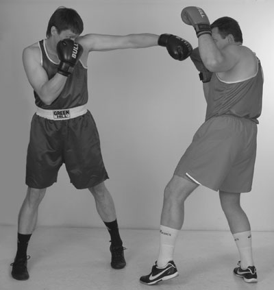 Теперь о самих ударах. При большой осторожности после шага назад наносят одиночные удары передней рукой. Фото 153, 154. Это дает возможность изучить манеру противника, привыкнуть к ней и дать привыкнуть сопернику к ритму, задав определенный темп. Соперник, промахиваясь и получая в ответ, сбивает дыхание и тратит силы. Вариант ответного удара зависит от положения передней руки на оттягивании. Поэтому станьте в пару с партнером и пробуйте на шаге назад, на его ударе тренировать замахи на разные удары своей передней рукой. Пробуйте наносить эти удары, но с обязательным шагом какой-нибудь ногой в удар. Из-за этого наш удар будет более четким и жестким. Привыкнув, пробуйте наносить два удара передней рукой или проводить двойку передней и задней рукой. Можно сочетать разные комбинации: снизу, прямо; прямо, сбоку; голова, корпус и так далее. Акцентируйте второй удар и обязательно делайте в конце защитное движение.