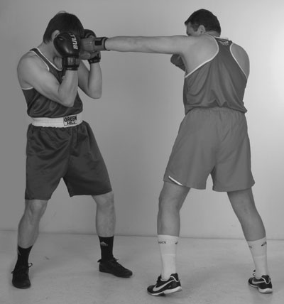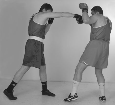 При боковых ударах соперника нам в голову передняя рука на движении назад либо подводится близко к голове, либо немного опускается. Это делается с целью устранения помех на пути руки соперника, чтобы сила его инерции заставляла его сильнее заваливаться вперед и вбок. Вот почему он должен сам налетать на наши кулаки. Нам остается, стоя на месте, пробить какое-то количество ударов.