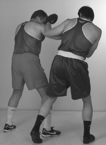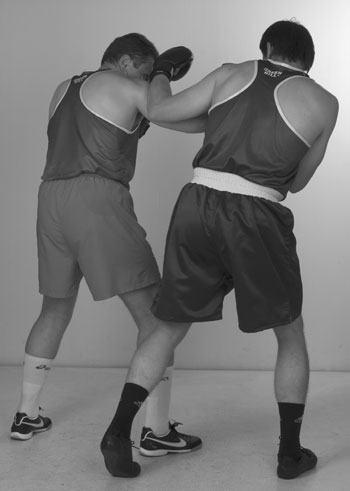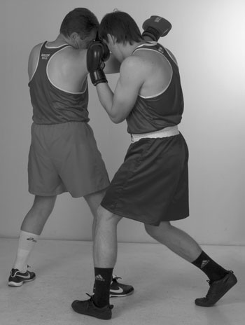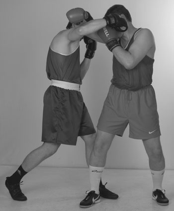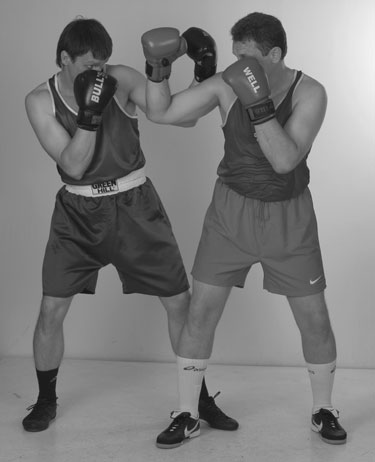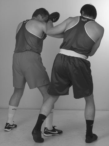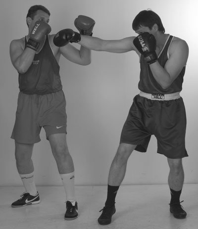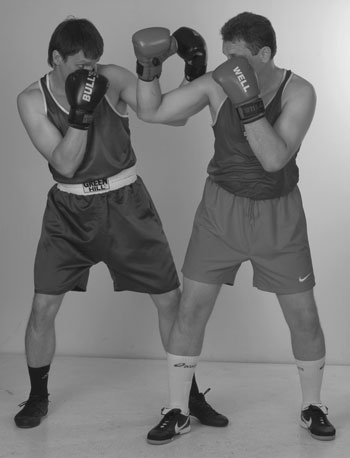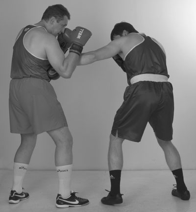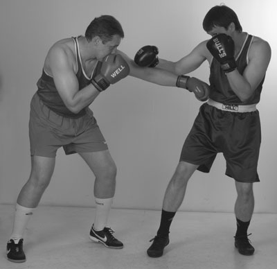 удар. Отбив, два удара. Передняя нога заходит партнеру за его переднюю ногу.Соперник будет стараться держать свою руку выше нашей передней руки, поэтому иногда нужно бить нашей передней рукой ему в голову, под его переднюю руку. Он будет ее опускать и отдавать нам преимущество высоты кулака. Чередуя этот удар с ударом сверху и ударом в корпус мы будем путать соперника и выигрывать удобную для нас позицию. Фото 176, 177. Нужно быстро бить под руку и на движении назад заносить свою руку над его рукой. Если скорости удара и выхода из атаки не хватает, то данный удар можно имитировать вызовом.