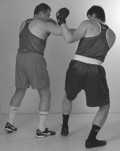 Разворот корпуса на движении назад нам нужен для того, чтобы в челночной работе, оттягиваясь, уйти с линии атаки противника после нашего удара. К тому же мы при этом движении будем заходить ему за спину с замахом на следующий удар. Наш кулак передней руки выше его кулака. Попробуем. Бью, ухожу, бью, ухожу. Соперник бьет прямым ударом туда, где нас уже нет.