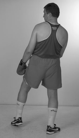 Наработав эти элементы, можно подключать заднюю руку. Отбив, двойка левой, правой. Отбив, левой, левой, правой. После атак, должен быть обязательный выход влево, за спину соперника, или назад, от него. Выход за спину может быть также с ударами. Фото 178. Для наработки этого элемента начнем отработку удара задней рукой. Атакуем противника правой рукой. Удар по своей технике получается встречный, так как мы бьем его с уклоном. При этом все равно, будет соперник бить или нет. Главное – ударить со смещением и не налететь на его переднюю руку. Тогда у нас, в конце движения голова окажется за его спиной, и, поднимаясь в стойку, мы выходим сопернику за спину всем телом, нанося один или два удара передней рукой. Фото 179, 180. Удар правой рукой, левой, левой рукой за спину. Кстати, вот когда представляется возможным нанести размашистый боковой удар задней рукой. Более того, все атаки против левши можно начинать с нашей задней руки именно размашистым боковым ударом, свингом. Фото 181, 182.