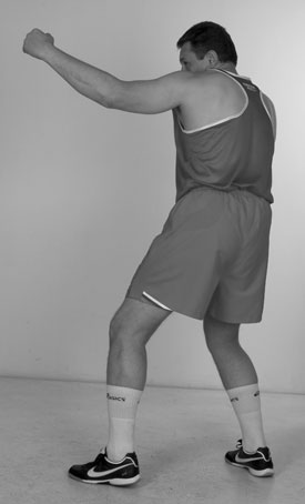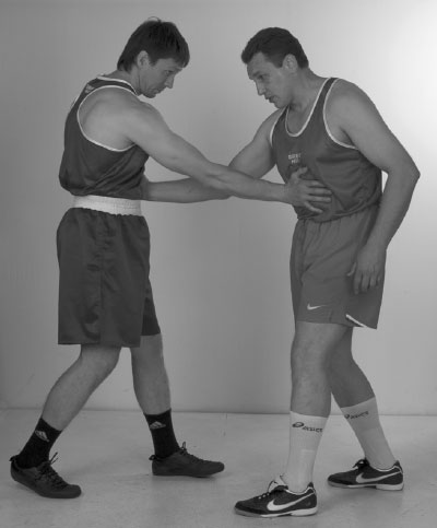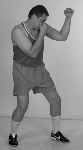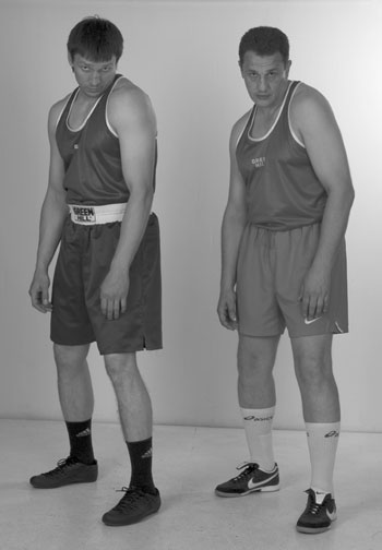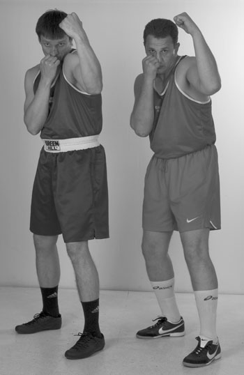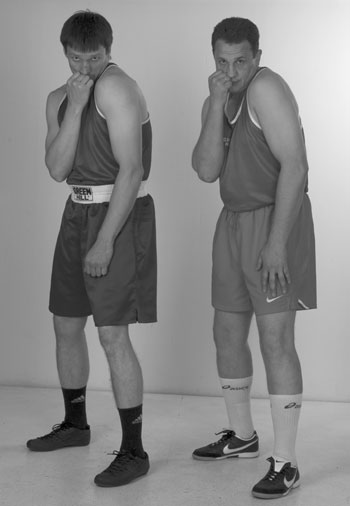 Представим себе квадрат со стороной чуть больше ширины плеч. Поставим переднюю ногу в верхний угол, а заднюю в противоположный, нижний, угол, по диагонали. При этом у правшей передняя нога левая, а у левшей правая. Вес тела слегка распределен на задней ноге, ноги чуть согнуты в коленях, ступни параллельны, как будто находятся на двух параллельных лыжных колеях, руки внизу. Стоим полубоком. Поднимем переднее плечо и закроем подбородок с одной стороны. Фото 8.