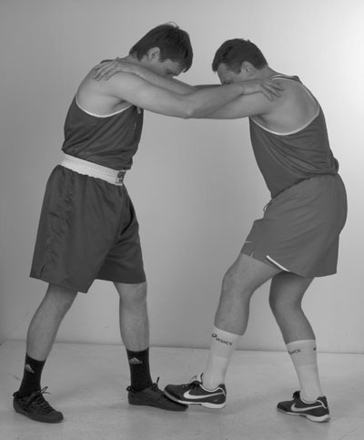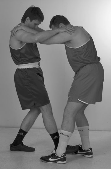 4. Руки на плечах противника, пятнашки ногами. Цель – наступить партнеру на стопу и не дать наступить себе. Фото 5, 6.