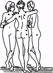 было отмечено в самых ранних описаниях. Впервые H. Smyth предложил наличие болевых точек в качестве критерия диагностики ФМ в 1972 г. В последующем на важность выявления специфических чувствительных точек в диагностике ФМ указывали многие авторы (Croft P. et al., 1994). ТР являются главной составной частью современных критериев ФМ. Сами больные могут не знать о наличии у них этих точек, что зачастую вызывает у них крайнее удивление. ТР имеют характерные особенности: чтобы вызвать боль, достаточно легкого усилия; при пальпации можно получить ту боль, которая у больных возникает спонтанно; болевые точки расположены строго в определенных местах, т.е. имеется специфическая карта ТР.Распределение болевых точек (ТР) при ФМ представлено на рисунке.