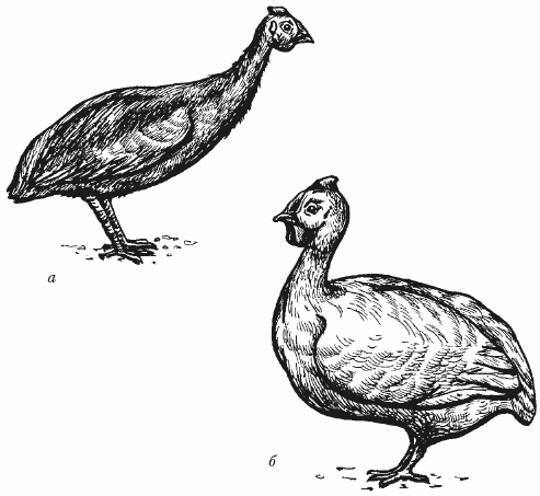 Туловище цесарок горизонтально поставленное, овальное по форме. Шея короткая. Голова большая с крепким гребневым наростом. Короткий хвост опущен вниз.