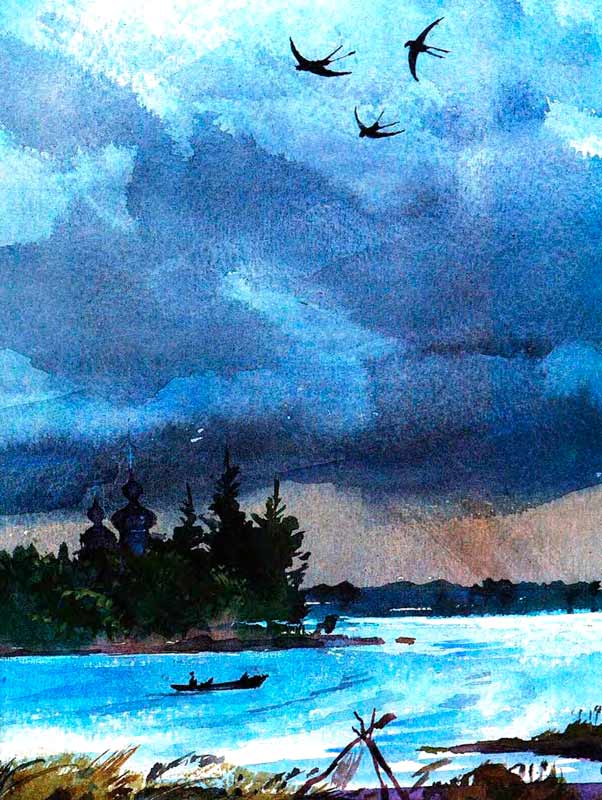 Ещё до рассвета проснулись чуткие журавли. Чуть брезжит над рекой, над лесными чёрными макушками ранняя зорька. Тёмным и мрачным кажется в эту пору глухой лес. Один за другим журавли поднимаются с болота.