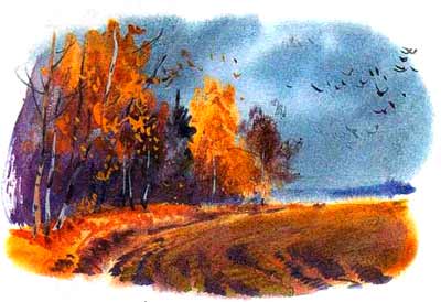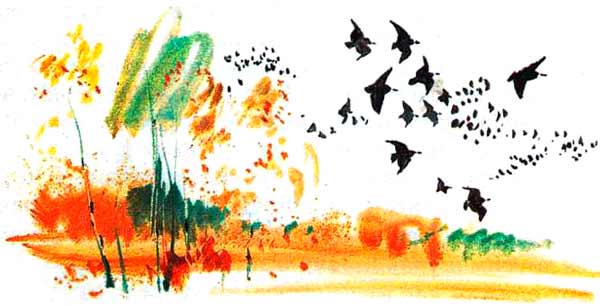 В воздухе захолодало. На кустах и деревьях пожелтела листва. Лес оделся в разноцветный убор. Грачи и другие перелётные птицы давно уже собрались в стаи. И вот наконец в прохладном осеннем небе слышится прощальное курлыканье журавлей.