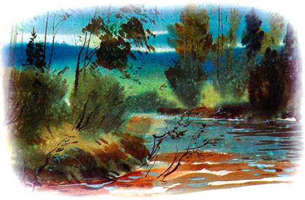 В этот ранний час в лесу просыпаются птицы, бегают по берегу проворные кулики. Скоро взойдёт над рекой и лесом весёлое солнце. Всё тогда засияет, всё переменится в осеннем тёмном лесу.
