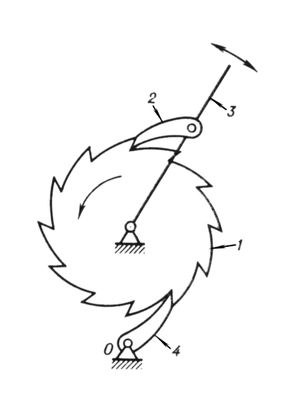 Храпово'й механи'зм, храповик, зубчатый механизм для преобразования возвратно-вращательного движения в прерывистое вращательное движение в одном направлении. Х. м. состоит из храпового колеса 1 (рис. ), собачки 2, которая прижимается к зубу колеса 1 под действием пружины или собственного веса, ведущего рычага 3 и стойки 0. При движении рычага против часовой стрелки собачка поворачивает храповое колесо на некоторый угол. При обратном движении рычага собачка проскальзывает на один или несколько зубьев, а храповое колесо удерживается от обратного вращения дополнительной собачкой 4. Х. м. применяется в велосипедах, станках и др. машинах. В грузоподъёмных машинах Х. м. предотвращает обратное вращение барабана лебёдки под действием груза.