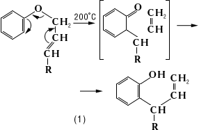Кла'йзена перегруппиро'вка, миграция аллильной или замещенной аллильной группы в аллиловых эфирах фенолов (1) или енолов (2) с образованием соответственно орто-аллилфенолов или С-аллильных производных кето-енолов: