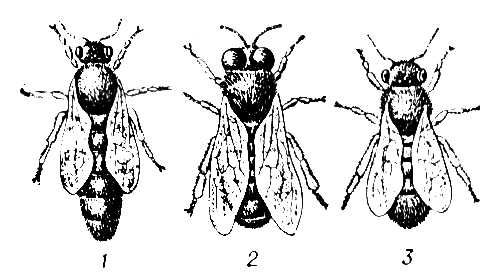 Особи пчелиной семьи: 1 — матка; 2 — трутень; 3 — рабочая пчела.
