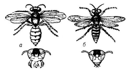 Пчелиный волк: а — самка; б — самец (внизу — их головы в увеличенном виде).