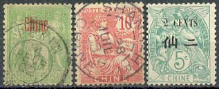 Французская почта в Китае. Первое франц. почт. отделение в Китае было открыто в Шанхае в 1862, использ. марки Франции и штемпеля с № 4013 и 5104. Затем почт. отделения были открыты в Амое (Сянмыне), Нинбо, Пекине, Тяньцзине, Фучжоу, Ханькоу и Чифу. В 1893— 1900 вып. специальные марки для франц. почты в Китае — марки Франции с надпечаткой (франц.) «Китай». В 1902, 1903 изд. марки с той же надписью. С 1907 на марках стала производиться надпечатка нового номинала в кит. валюте. Франц. почт. отделения в Китае были закрыты 31.12.1922.