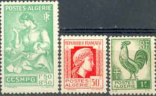 Выпуски Французского комитета национального освобождения в Алжире. В 1943 в пользу беженцев из оккупированной Франции, а также бойцов Движения Сопротивления была изд. серия почт.-благотворительных марок с доплатой. На них имелось назв. Комитета. В 1943 вып. еще 2 марки с обычными для франц. марок текстами. Предполагалось использ. эти марки только в колониях Франции. Однако после высадки франц. войск на о. Корсика они поступили в обращение на о-ве, а с нояб. 1944 по всей Франции. В 1944, 1945 Комитетом была изд. серия станд. марок с изображением Марианны и галльского петуха (символы Франции). Она признана официальным вып. франц. почты.