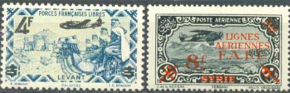 Выпуски Свободной Франции в Леванте. В 1942 на тер. Сирии и Ливана, занятых войсками Свободной Франции, в обращение поступили марки Сирии и Ливана с надпечатками лотарингского креста, нового номинала и текста (франц.) «Войска Свободной Франции. Левант» и «Авиалинии Военно-Воздушных сил Свободной Франции». Позднее вып. марки и блок с теми же надписями. В 1943 на марках 4 номиналов (по 2 почт. и авиапочт.) сделана надпечатка слова (франц.) «Сопротивление» и дополнительного номинала. Они продавались в качестве почт.-благотворительных марок в пользу бойцов Движения Сопротивления.