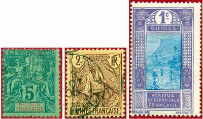 ФРАНЦУЗСКАЯ ГВИНЕЯ [Guinee Francaise] — б. франц. колония в Зап. Африке. С 02.10. 1958 — независимая Гвинейская Республика. Первые марки колониального типа вып. в 1892. В 1904 заменены марками оригинального рис. В 1915 изд. почт.-благотворительная марка, первые памятные марки — 1931, первый блок — 1937, авиапочт. марки— с 1940, доплатные — 1905. С 1944 использ. марки Франц. Зап. Африки.