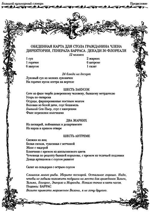 любопытную запись, сделанную его рукой:Слишком много рыбы. Уберите пескарей. Остальное хорошо. Надо, чтобы не забыли положить подушки на места для гражданок Тальен, Тальма, Богарне, Энгерло и Миранды. Начало точно в пять часов. Подпись: БАРРАС