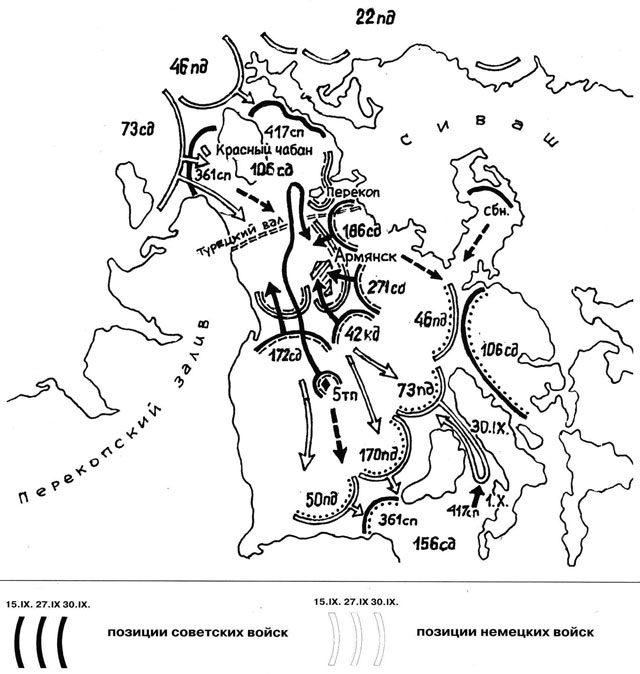 15 сентября противник перешел в наступление. Его части овладели станцией Сальково и вышли на Арабатскую стрелку. Основные силы противника развивали наступление на Перекоп и Армянск.
