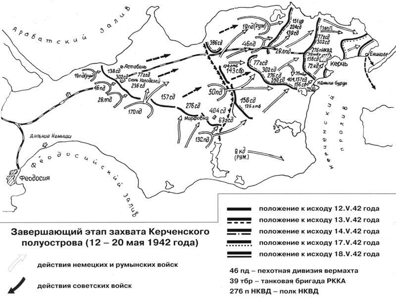 все более угрожающим, Ставка ВГК 11 мая в 23.50 отдает по «Бодо» приказ главкому Северо-Кавказского направления маршалу Буденному:"Ввиду того, что Военный совет Крымфронта, в т. ч. Мехлис, Козлов, потеряли голову, до сего времени не могут связаться с армиями, несмотря на то, что штабы армий отстоят от Турецкого вала не более 20—25 км, ввиду того, что Козлов и Мехлис, несмотря на приказ Ставки, не решаются выехать на Турецкий вал и организовать там оборону, Ставка Верховного Главнокомандования приказывает Главкому СКН маршалу Буденному в срочном порядке (фактически такой выезд состоялся только 13 мая. — Прим. авт.) выехать в район штаба Крымского фронта (г. Керчь), навести порядок в Военном совете фронта, заставить Мехлиса и Козлова прекратить свою работу по формированию в тылу, передав это дело тыловым работникам, заставить их выехать немедленно на Турецкий вал, принять отходящие войска и материальную часть, привести их в порядок и организовать устойчивую оборону на линии Турецкого вала, разбив оборонительную линию на участки во главе с ответственными командирами. Главная задача — не пропускать противника к востоку от Турецкого вала, используя для этого все оборонительные средства, войсковые части, средства авиации и морского флота". [17]