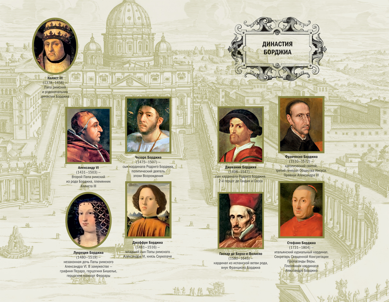 Династия Борджиа – эта фамилия стала синонимом распущенности, коррупции, симонии, интриг и ряда других преступлений. Про них написано немало книг и снято фильмов, но все ли в них правда? Скорее всего, этого мы уже никогда не узнаем. Представители этой испанской династии доминировали на итальянской сцене в XV–XVI веках и оставили после себя неприглядную славу. Их обвиняют в разврате, инцесте, непотизме, кровавых убийствах, отравлениях и даже в предполагаемом братоубийстве,