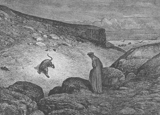 Восхождению поэта на холм спасения препятствуют три зверя: рысь (ср. А., XVI, 106…108) — сладострастие, лев — гордость и волчица (ср. Ч., XX, 10…15) — корыстолюбие.