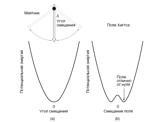 (a) В случае простого маятника, движущегося без учета трения, кривая потенциальной энергии имеет форму параболы и нулевая потенциальная энергия соответствует нулевому смещению маятника от вертикали. Однако кривая потенциальной энергии для поля Хиггса (b) имеет другую форму. Теперь нулевое значение потенциальной энергии соответствует конечному смещению (самого поля) или тому, что физики называют ненулевым значением вакуумного ожидания