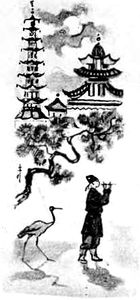 А ночью в дверь чайной кто-то сильно постучал. Хозяин пошёл открывать — видит, стоит студент Ми и молчит. Вынул Ми из кармана дудочку, заиграл и пошёл прочь не оглядываясь. Аист встрепенулся, соскочил со стены и последовал за ним. С тех пор никто уже никогда не видел студента Ми и его волшебного жёлтого аиста.