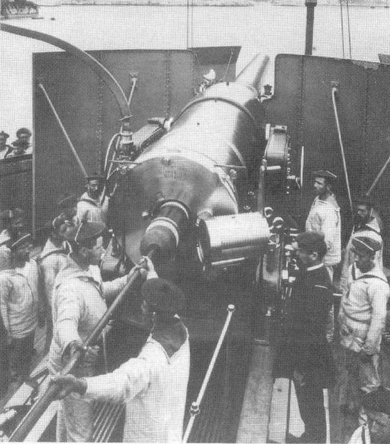 У кормового орудия на броненосце "Девастасьон" во время учений.