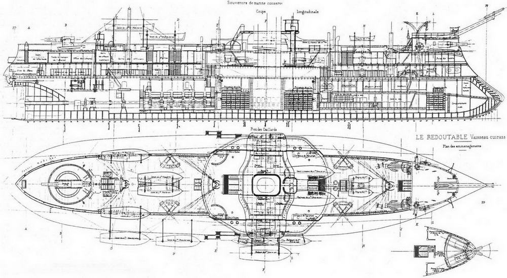 Броненосец "Редутабль". 1878 г. (Продольный разрез корпуса и план верхней палубы)