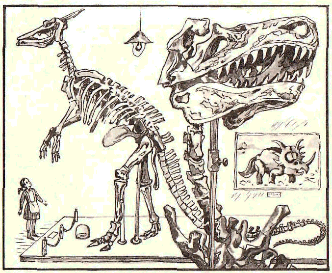 прошлое… Ио и Таня оказалась порядочной фантазеркой.Так мы и ходили с ней по залам музея с высокими сводчатыми потолками. И очутились в просторном светлом помещении. Посреди поднимался скелет громадного зверя. До самого потолка доставала его голова. Могучий хвост тянулся до стены. Это было величайшее животное, в незапамятные времена жившее па земле, – динозавр.