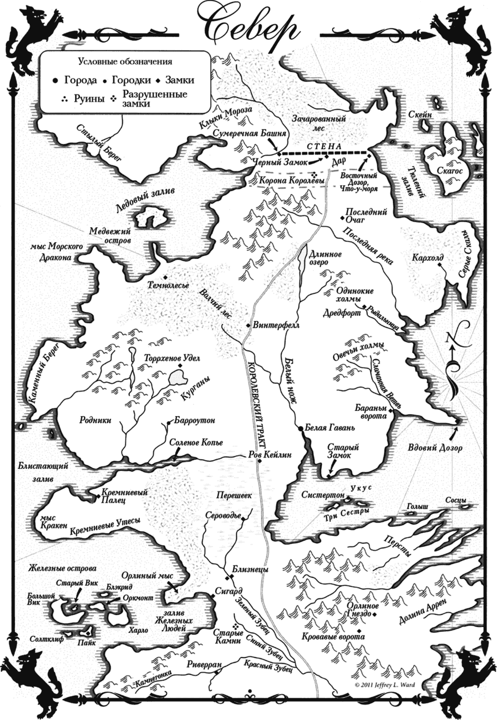 Вот она, Молочная, прямо перед ним. Каменные берега покрыты льдом, бледные воды струятся от самых Клыков Мороза. Теперь оттуда потекли еще и одичалые с Мансом-Разбойником во главе. Три дня назад в лагерь, весь в мыле, вернулся Торен Смолвуд. Пока он рассказывал Старому Медведю, что они обнаружили, его разведчик, Медж Белоглазый, рассказал то же самое остальным.