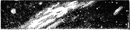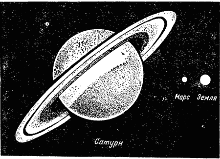 Сатурн кажется сейчас на небе почти рядом с Марсом, но в действительности он отстоит от нас на расстоянии в 15 раз большем, чем Марс. Сам Сатурн при рассматривании его в телескоп малоинтересен, так как его поверхность всегда закрыта плотным слоем облаков. Но невольное восхищение вызывает опоясывающее его кольцо (рис. 2). Это кольцо широкое и плоское, не сплошное, а состоит из множества небольших твёрдых «камешков», движущихся вокруг Сатурна. Это как бы ничтожно маленькие спутники, сопровождающие Сатурн в его движении вокруг Солнца. Кроме того, есть у Сатурна и девять больших спутников, обращающихся вокруг него подобно тому, как Луна обращается вокруг нашей Земли. Сам Сатурн с такой большой скоростью вращается вокруг своей оси, что смена дня и ночи происходит на нём каждые 10 часов.