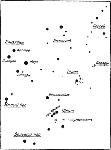 Две звезды созвездия Близнецов, расположенные влево от Марса и Сатурна, называются Кастором и Поллуксом. Я уже говорил о разнице в расстояниях от нас Марса и Сатурна. Но что это в сравнении с огромной удалённостью звёзд! Даже более близкая звезда — Поллукс находится от нас в 250 000 раз дальше, чем Сатурн. А расстояние до Кастора ещё больше.