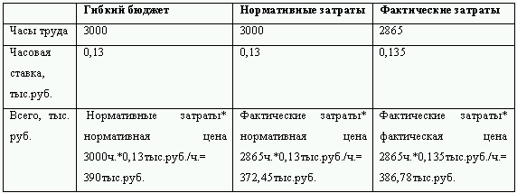 На производство полного объема продукции необходимо затратить 3000часов. Часовая ставка нормирована как 0,13 тыс. руб./ч. Вся продукция была изготовлена за 2865часов, при этом часовая ставка составила 0,135 тыс. руб. Определим отклонения затрат на труд по цене и эффективности: