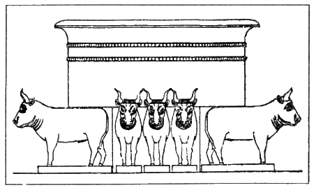 Хотя Библия замалчивает эту связь событий, есть несколько достойных внимания моментов, которые подкрепляют наш тезис. Мы уже упоминали колонны Яхин и Боаз, следы культа Ваала-Астарты. Другой культовый объект Соломонова храма приведет нас тоже к культу Ваала: «Медное море», колоссальный водный бассейн, который стоял на 12 быках. По три быка указывали, соответственно, на четыре стороны света (3 Царств 7.23).