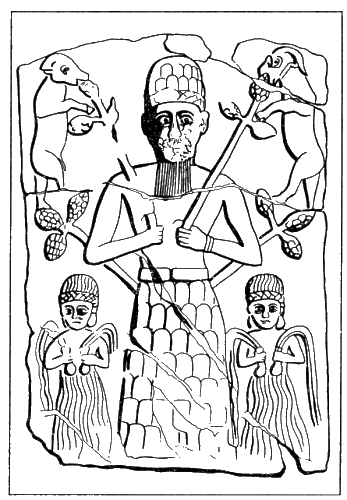 Уже во II тысячелетии до н. э. появляется рельеф из гипса, который прикреплен к колодцу храма в Ашшуре. В центре стоит Горный бог, его можно узнать по чешуйчатому рисунку в виде скал на юбке и головном уборе. От его бедер отходят плодоносящие стебли, а в руках он держит другие «древа жизни», которые жуют ягнята. По обе стороны от него две нимфы, они держат в руках сосуды, из которых бьют водные струи. Все вместе это изображает горный рай, который свидетельствует о дарующей жизнь силе воды и деревьев.