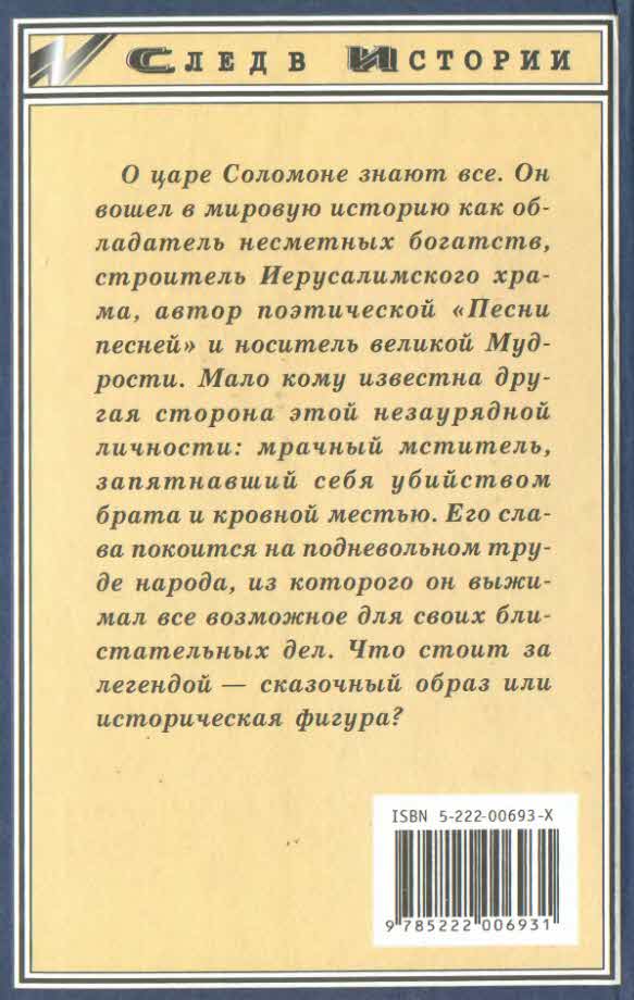 О царе Соломоне знают все. Он вошел в мировую историю как обладатель несметных богатств, строитель Иерусалимского храма, автор поэтической «Песни песней» и носитель великой Мудрости. Мало кому известна другая сторона этой незаурядной личности: мрачный мститель, запятнавший себя убийством брата и кровной местью. Его слава покоится на подневольном труде народа, из которого он выжимал все возможное для своих блистательных дел. Что стоит за легендой — сказочный образ или историческая фигура?