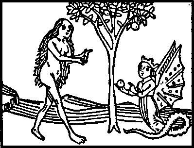 Аугсбург, 1470 г. Лилит в короне и с крыльями в образе змея протягивает Еве яблоко.