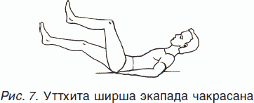 Лягте на спину, положив руки под ягодицы или вытянув вдоль тела. Поднимите голову, поочередно сгибая ноги, выполняя движение «езда на велосипеде». При движении колени попеременно оказываются у груди. Каждая ступня при этом описывает круги. Держите голову поднятой (слабые люди не должны поднимать головы). Если чувствуете усталость, отдохните, а затем повторите упражнение один или два раза. Упражнение устраняет дефекты ягодиц, талии, живота, спины, груди, ног, коленей, ступней. Оно очищает семя, устраняет ночные поллюции, очищает кровь, изгоняет кольчатых червей и даже излечивает паралич. Регулярной практикой этого упражнения достигается здоровье и сила всего организма.