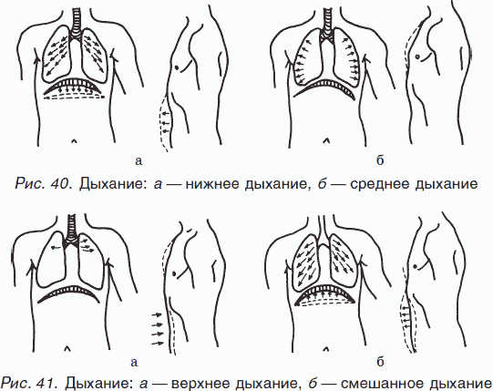 Верхнее дыхание, или, по-другому, «ключичное», когда дыхание осуществляется только за счет поднятия ключиц и плеч вверх, при неподвижной грудной клетке и некотором втягивании диафрагмы. При этом в основном вентилируются верхушки легких и немного средняя часть.