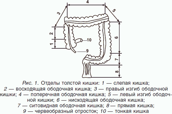 Диаметр различных отделов толстой кишки неодинаков. В слепой кишке и восходящем отделе он достигает 7—8 см, а в ситовидной всего 3—4 см.