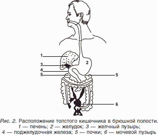 Толстый кишечник располагается в брюшной полости и соприкасается либо располагается в непосредственной близи со всеми брюшными органами.