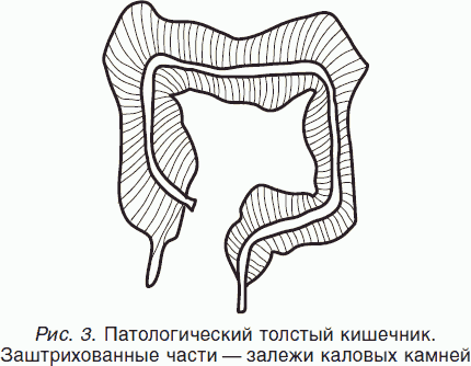 Выдающийся немецкий врач-хирург сделал 280 посмертных вскрытий и в 240 случаях обнаружил приблизительно такую картину, как на рис. 3. Другой врач, из Лондона, разрезав толстую кишку одного умершего, извлек из нее 25 фунтов (10 кг) старого «закаменелого» кала и по сей день хранит его в большой банке со спиртом.