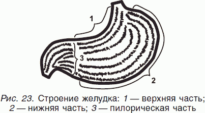 Желудок в процессе эволюции возник как орган, депонирующий пищу и осуществляющий начальные стадии гидролиза (кислотная денатурация пищи). Функции желудка многообразны, и он имеет сложное строение. Например, различные «поля» желудка выделяют различный пищеварительный сок. Верхняя кривизна желудка выделяет быстро очень кислый сок; нижняя кривизна – менее кислый и длительно; пилорическая часть – щелочной и все время. Теперь нам становится ясно, отчего на верхней части (кривизне) желудка чаще всего возникает язвенный процесс и злокачественные новообразования.