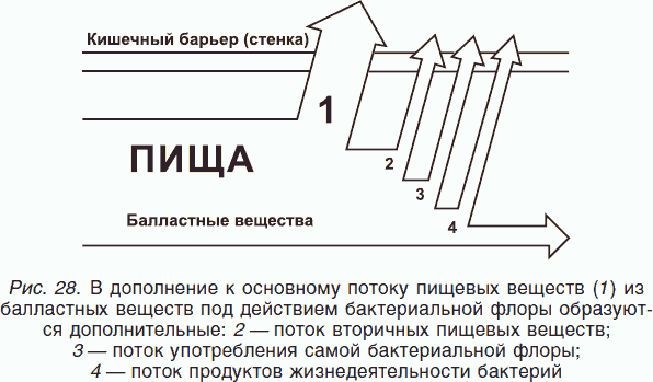 В результате эволюции развились симбиозные взаимоотношения между организмом хозяина и бактериями, населяющими его желудочно-кишечный тракт. Между ними осуществляется обмен метаболитами (продуктами жизнедеятельности), в состав которых входят пищевые вещества, различные неорганические компоненты, стимуляторы, ингибиторы, гормоны и другие физиологически активные вещества. Бактериальная флора служит своеобразным трофостатом – обеспечивает нужное пищевое соотношение веществ в желудочно-кишечном тракте, разрушая некоторые избыточные компоненты пищи и образуя недостающие продукты. Недаром у некоторых животных (в основном, травоядных) масса бактериальной флоры может составлять 1/7 часть массы тела животного.