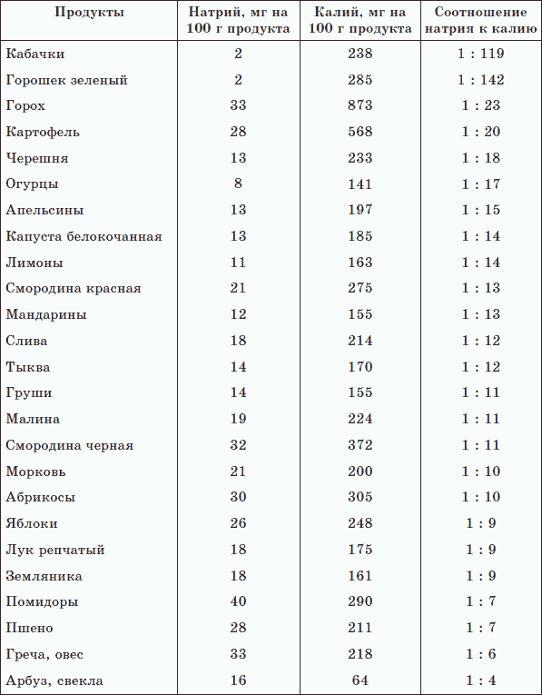 В начале перехода на правильное питание употребляйте много калиевой пищи, а месяца через 2—3 старайтесь придерживаться соотношения Na : К – 1 : 20. Ниже приведена таблица соотношения натрия и калия в продуктах. Постарайтесь творчески использовать