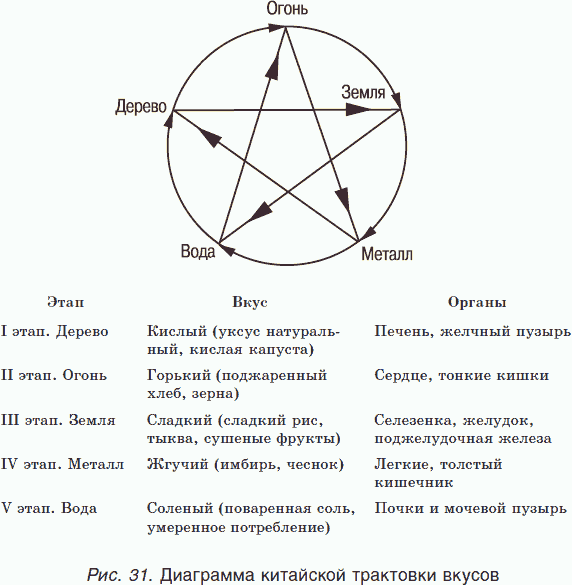 Согласно китайской теории пяти первоэлементов «У-син» каждый процесс имеет начало и конец, проходя последовательно через пять стадий, или этапов. Энергетика человеческого организма подчинена этой последовательности, функции организма включаются последовательно одна за другой, имея пик активности и спада. Вкус пищи стимулирует энергетику функций тела. Например, кислый – печень и т. д., смотрите таблицу. Но если человек увлекается одним вкусом, то, стимулируя одну функцию, он подавляет другую. Так, слишком много соли подавляет функцию сердца, а слишком много сладкого вкуса поражает функцию почек. Приведенная диаграмма в виде звезды в круге показывает эти закономерности – порождение по окружности и угнетение по лучам звезды. Используя это, вы сможете стимулировать отстающие функции и подавлять сильные.